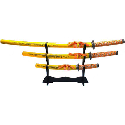3 Pc Japanese Yellow Dragon Katana Sword Set