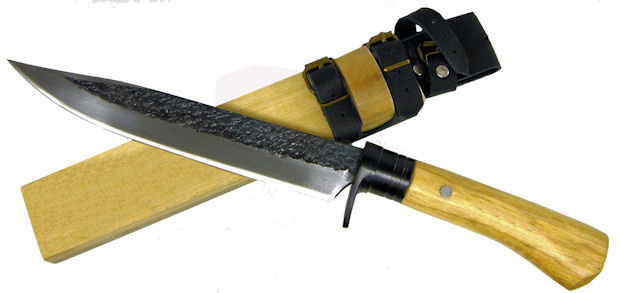 This is a very high quality hunting knife. The knife is 12.5" long and 9/32" thick. The knife is high quality carbon steel, and has a half push tang. With a thick metal rivet to hold the wood handle and the blade together. The sheath is also solid wood, and has a leather belt loop. **Editors Choice** |